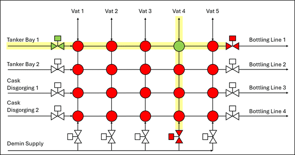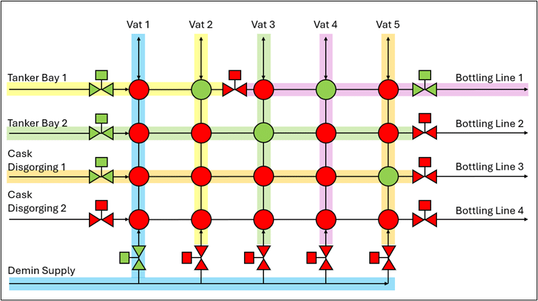 The number of different simultaneous operations that can go through a valve block can be increased by including additional isolation valves in-line. See Figure 3 where an isolation between the Vat 2 and Vat 3 columns allows transfers in from Tanker Bay 1 to Vats 1 or 2 whilst Vats 3 – 5 can transfer out to Bottling Line 1. This increased flexibility comes at the cost of additional footprint.